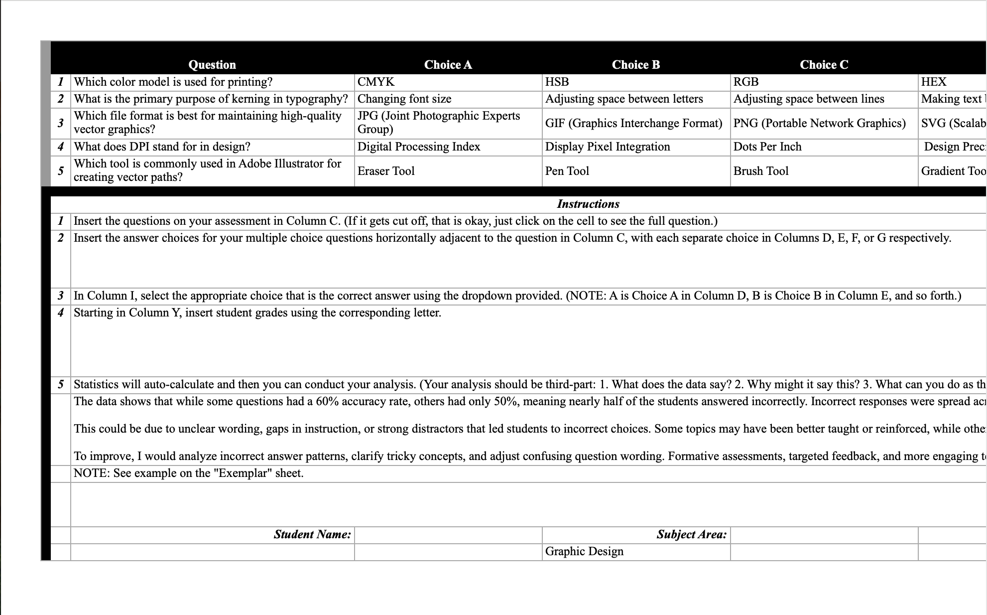 This project is a digital item analysis of a mock multiple-choice quiz for one of my graphic design classes. I designed a test with questions about design concepts (like color models, kerning, DPI, etc.), then collected student responses to see how well they understood the material.